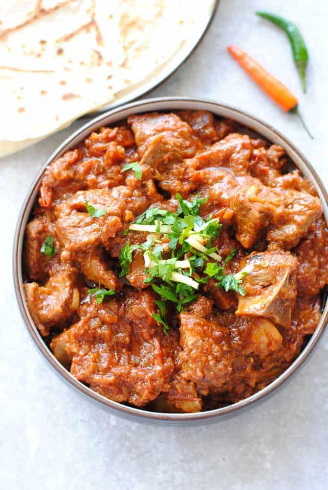 Gigot d’agneau préparé avec une sauce à l’ail, tomates, gingembre et coriandre fraîche